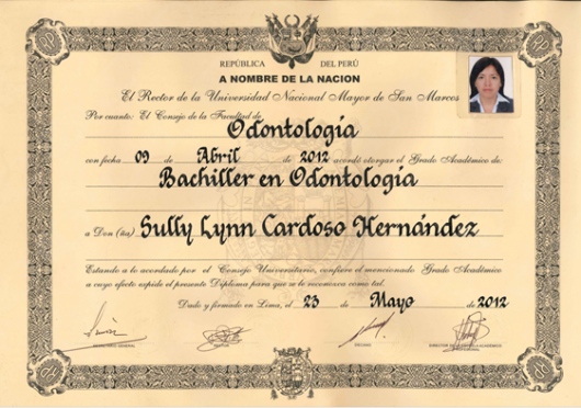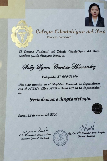 Soy egresada dela Universidad Nacional Mayor de San Marcos, con 14 años de experiencia, especialista en implantología oral (diplomado en UNMSM), y especialidad en Sao Paulo, Brasil